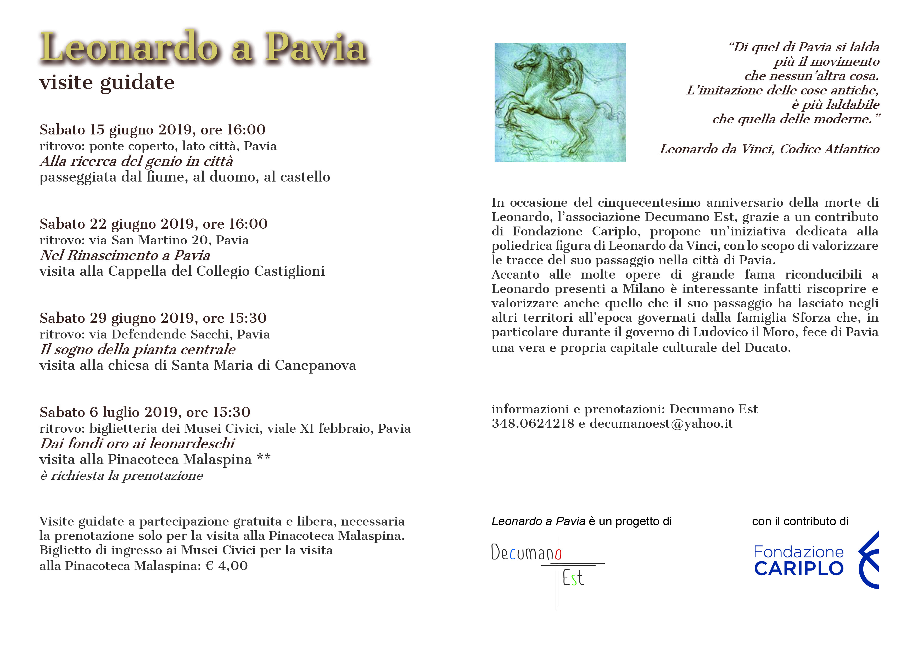 In occasione del cinquecentesimo anniversario della morte di Leonardo, Decumano Est, grazie a un contributo di Fondazione Cariplo, propone un'iniziativa dedicata alla poliedrica figura di Leonardo da Vinci, con lo scopo di valorizzare le tracce del suo passaggio nella città di Pavia.